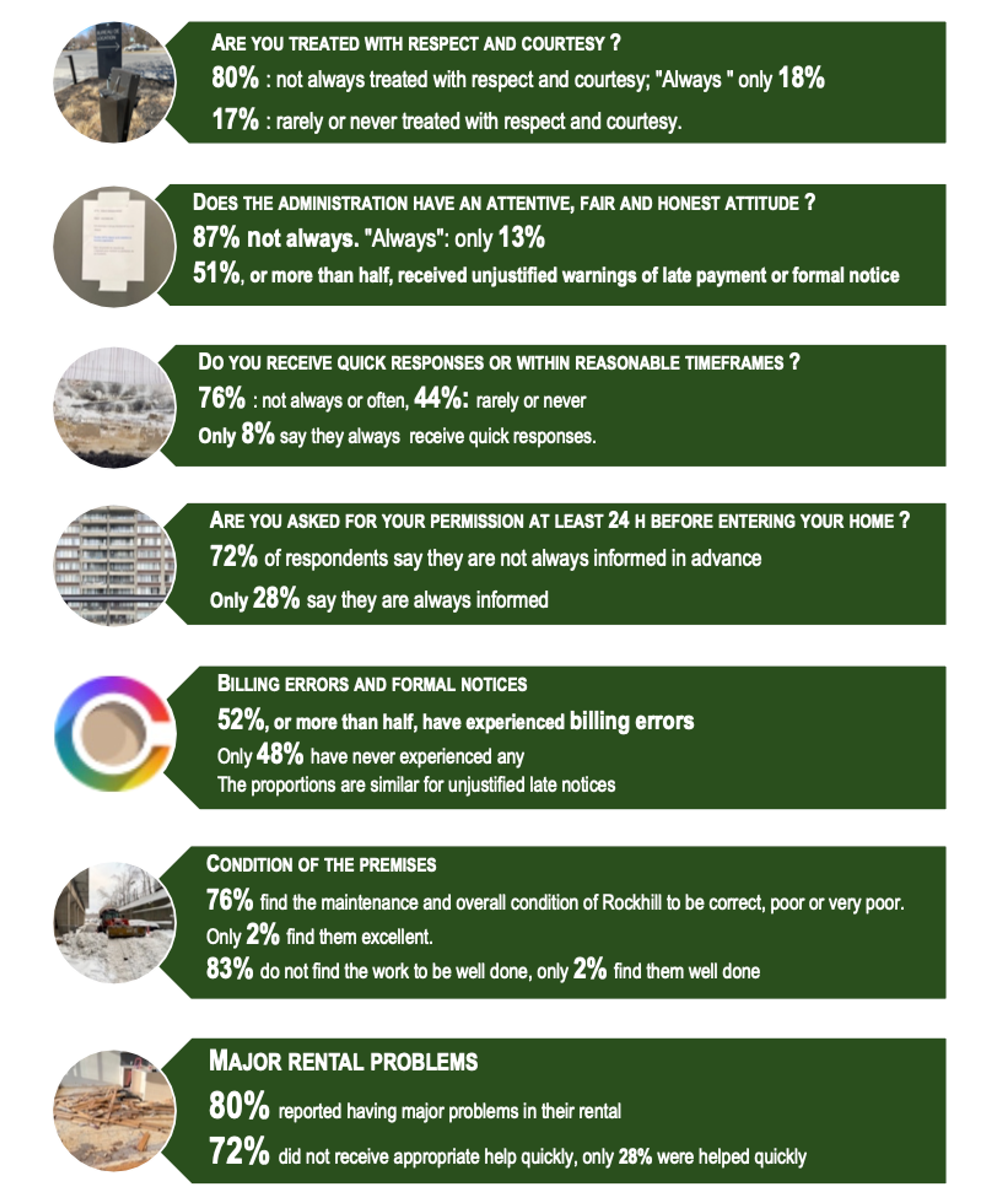 The CLR compiled the results of the bilingual survey that was distributed in the mailboxes of all apartments in the complex. To ensure the best possible representation of all buildings, responses collected in person (door-to-door) were added to the spontaneous responses (returns of completed questionnaires), in an approximate proportion of 50%-50%.