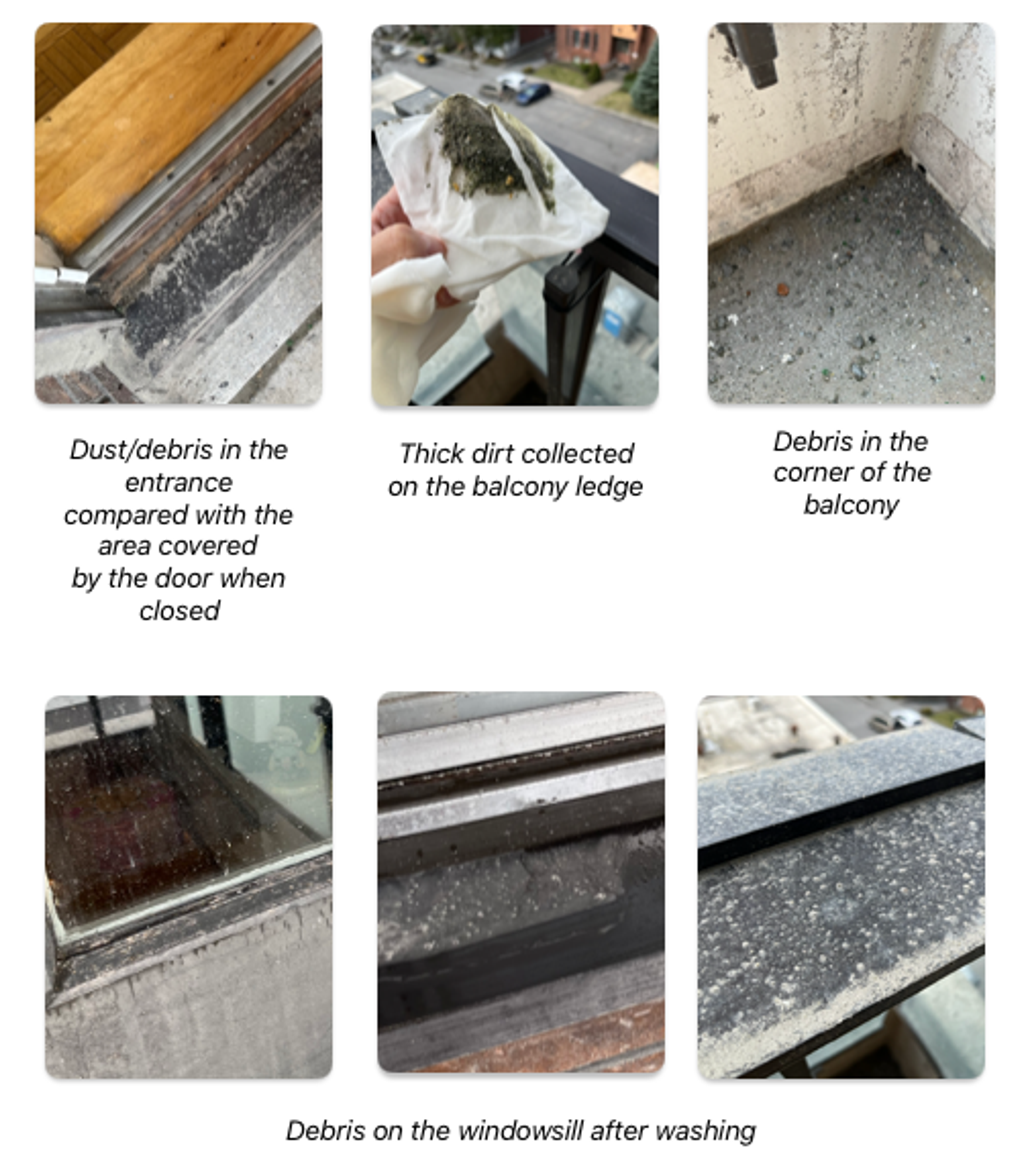 Long after the work on the concrete of the balconies, a team appeared without any warning to pressure wash the facades of the renovated balconies. Unfortunately, the technique used resulted in rubble and dust being sent onto the walls and windows.