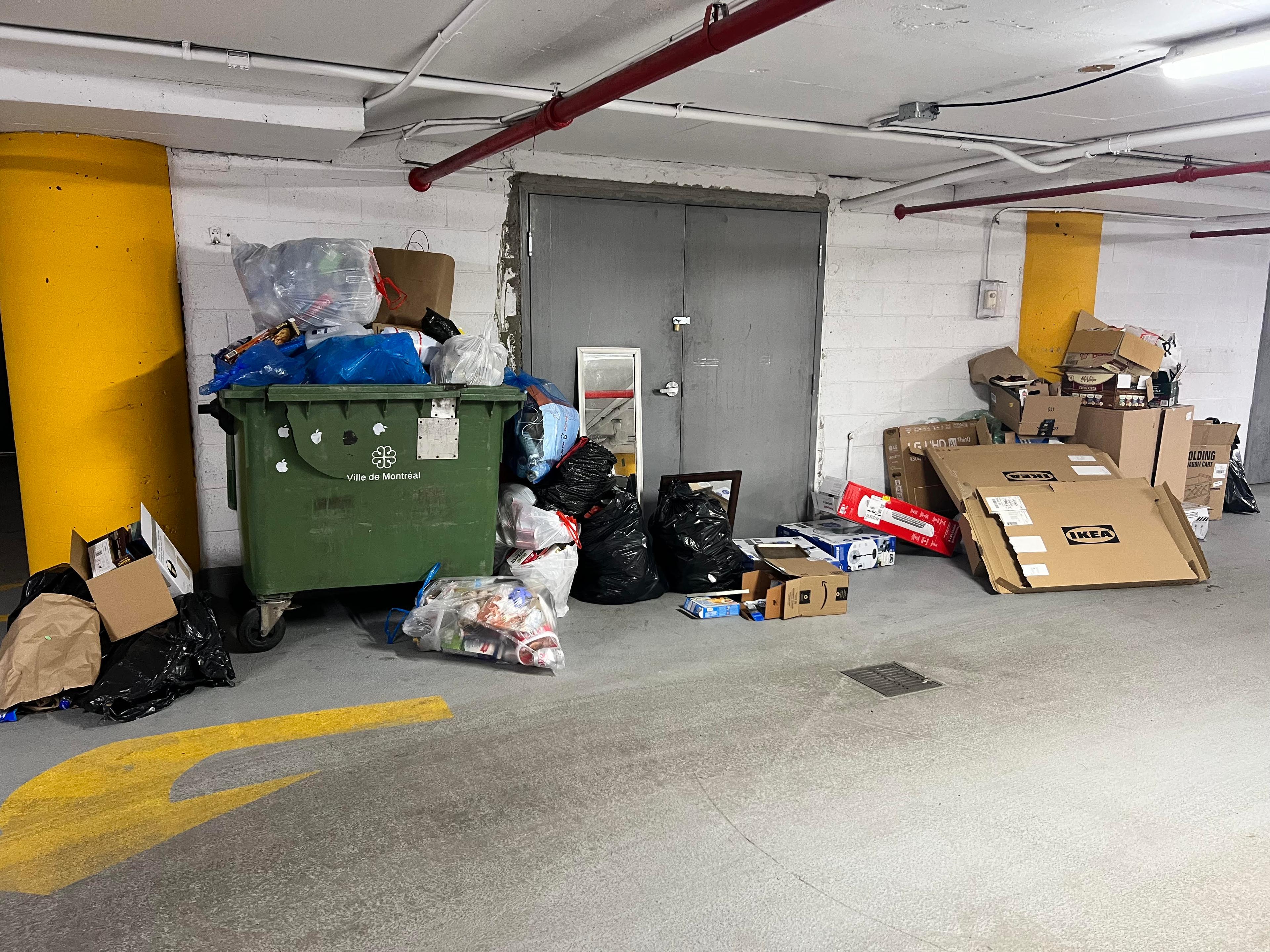 Encore beaucoup de vidanges par terre à cause d'une insuffisance de bacs, au lendemain du nettoyage de cet endroit au S1, créant un endroit propice pour la vermine: