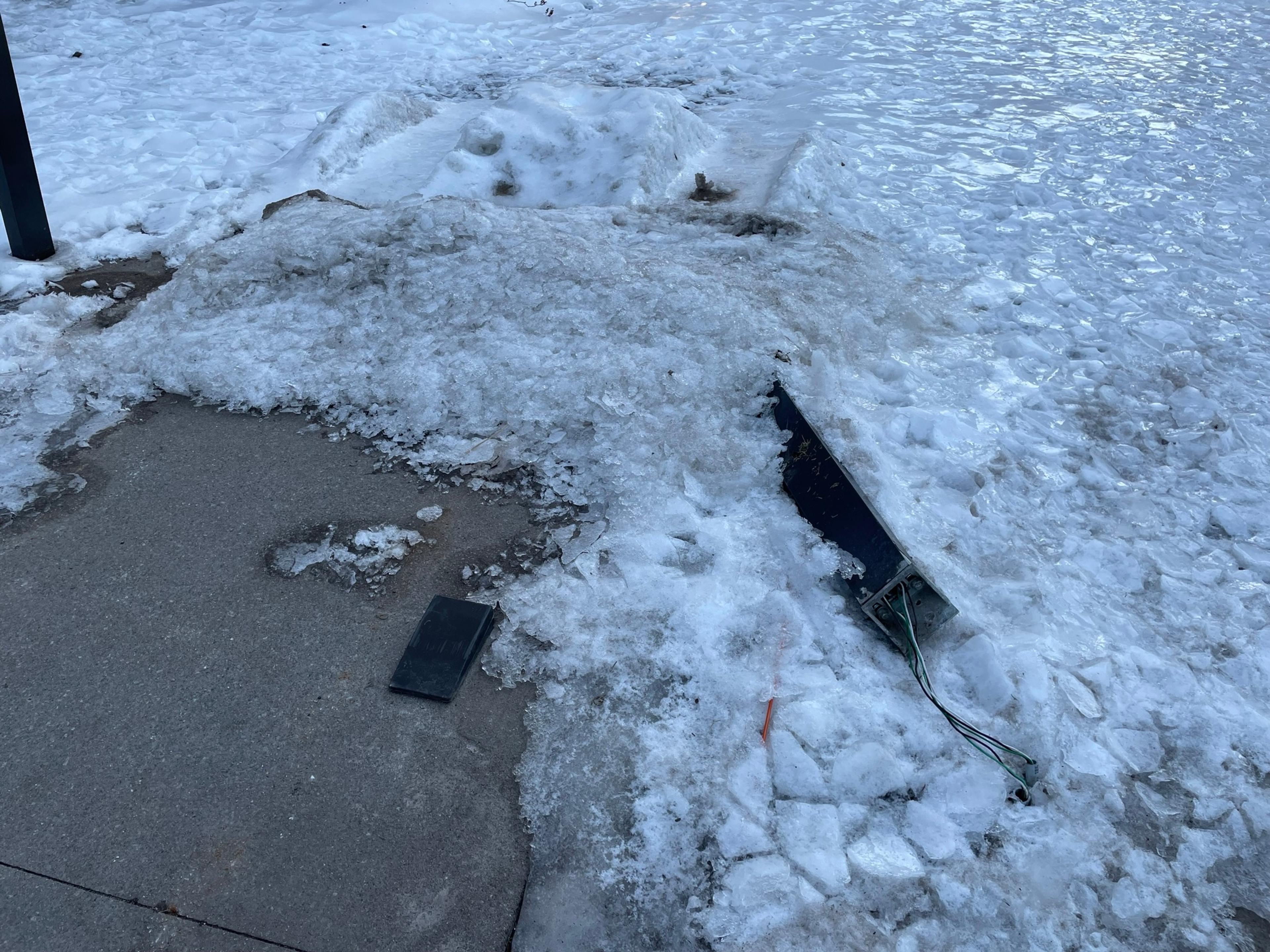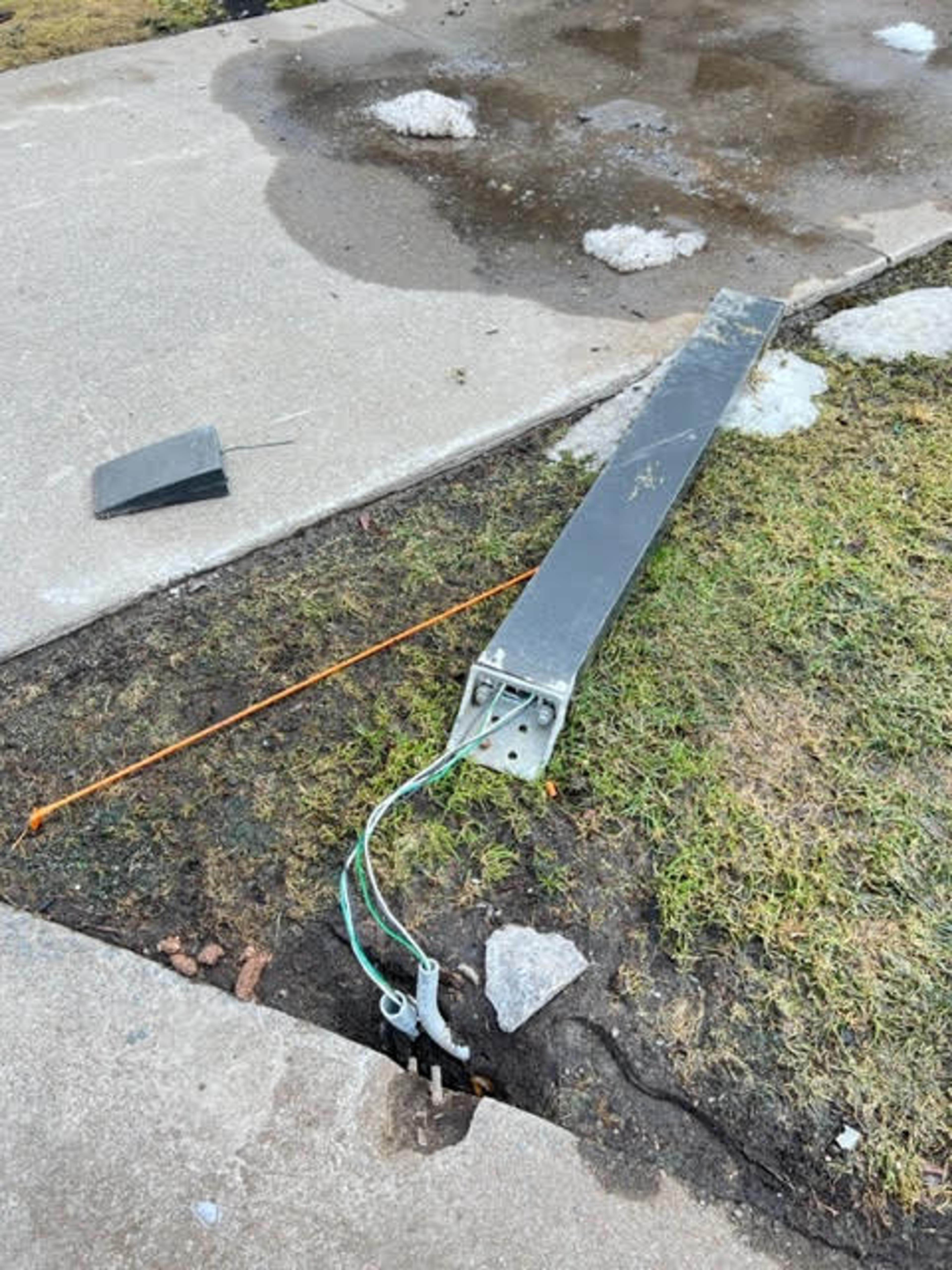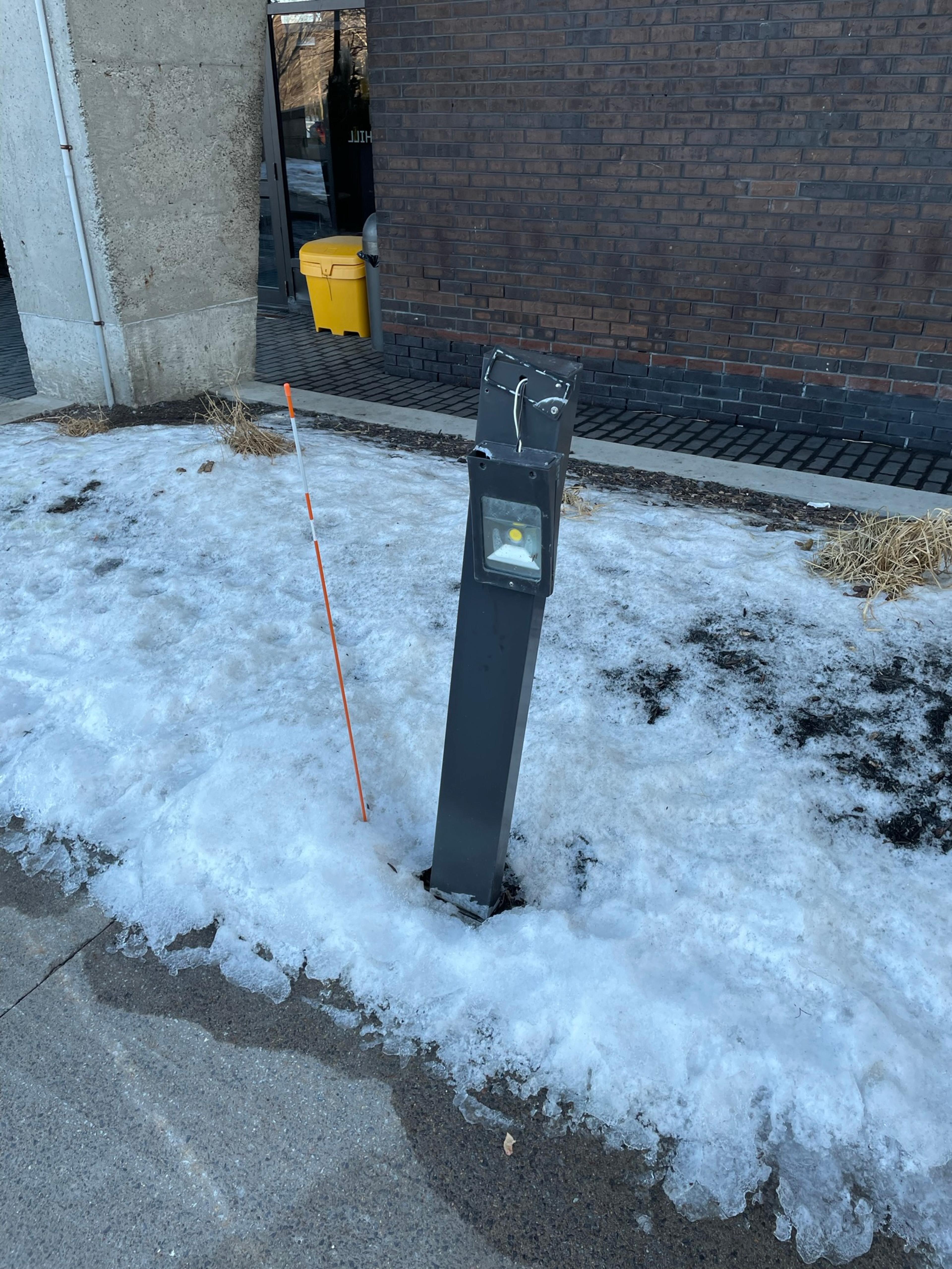 Les lampadaires brisés par le déneigement ne sont toujours pas réparés, ni même ramassés alors qu'ils sont en morceaux et que des fils électriques sont visibles.