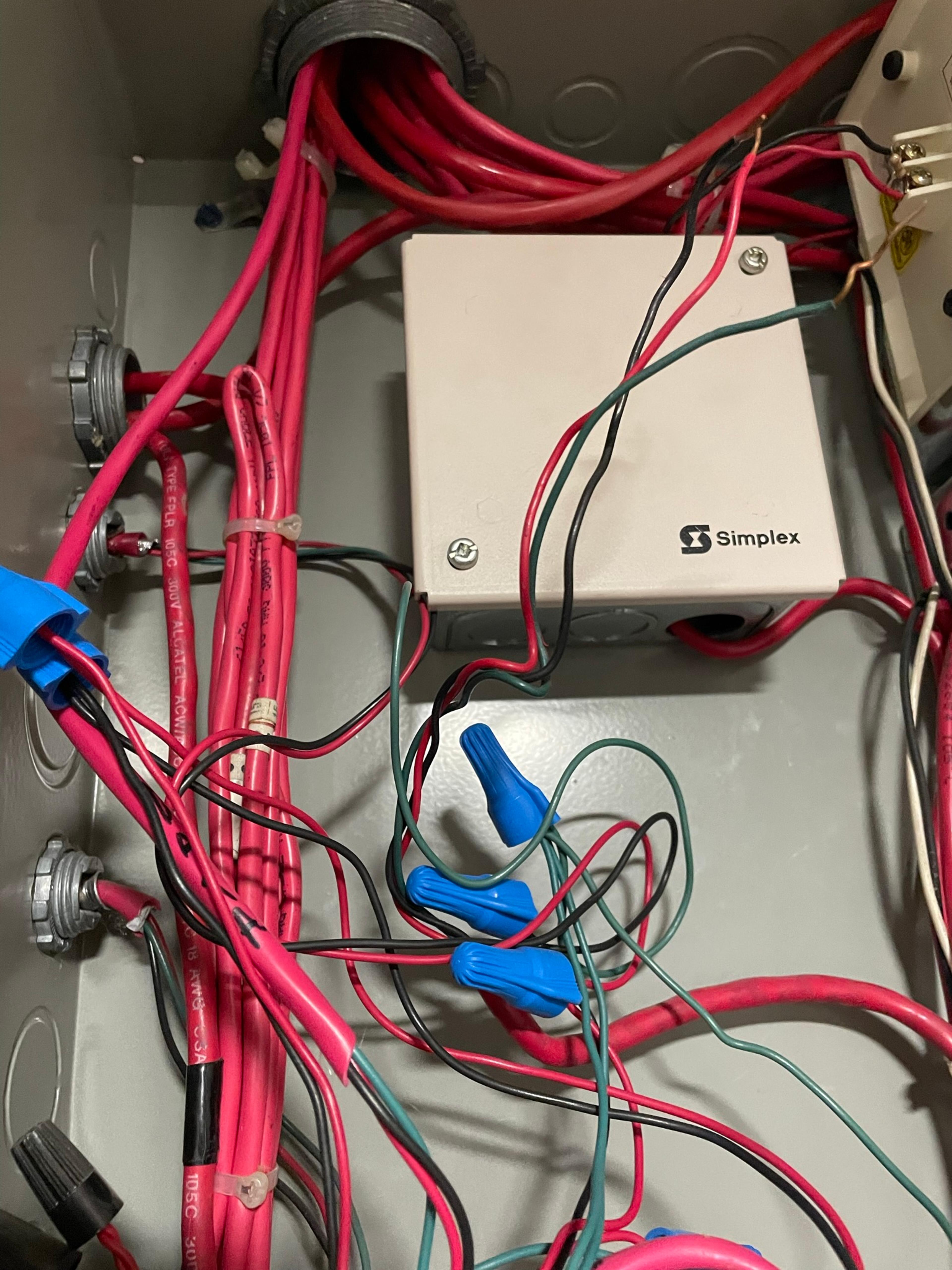 Dans la photo, l'appareil étiqueté "Simplex" est une marque bien connue spécialisée dans les systèmes d'alarme incendie et de sécurité. L'appareil montré sur la photo semble être un composant du système d'alarme incendie, peut-être une alimentation électrique ou un communicateur de contrôle pour le système.