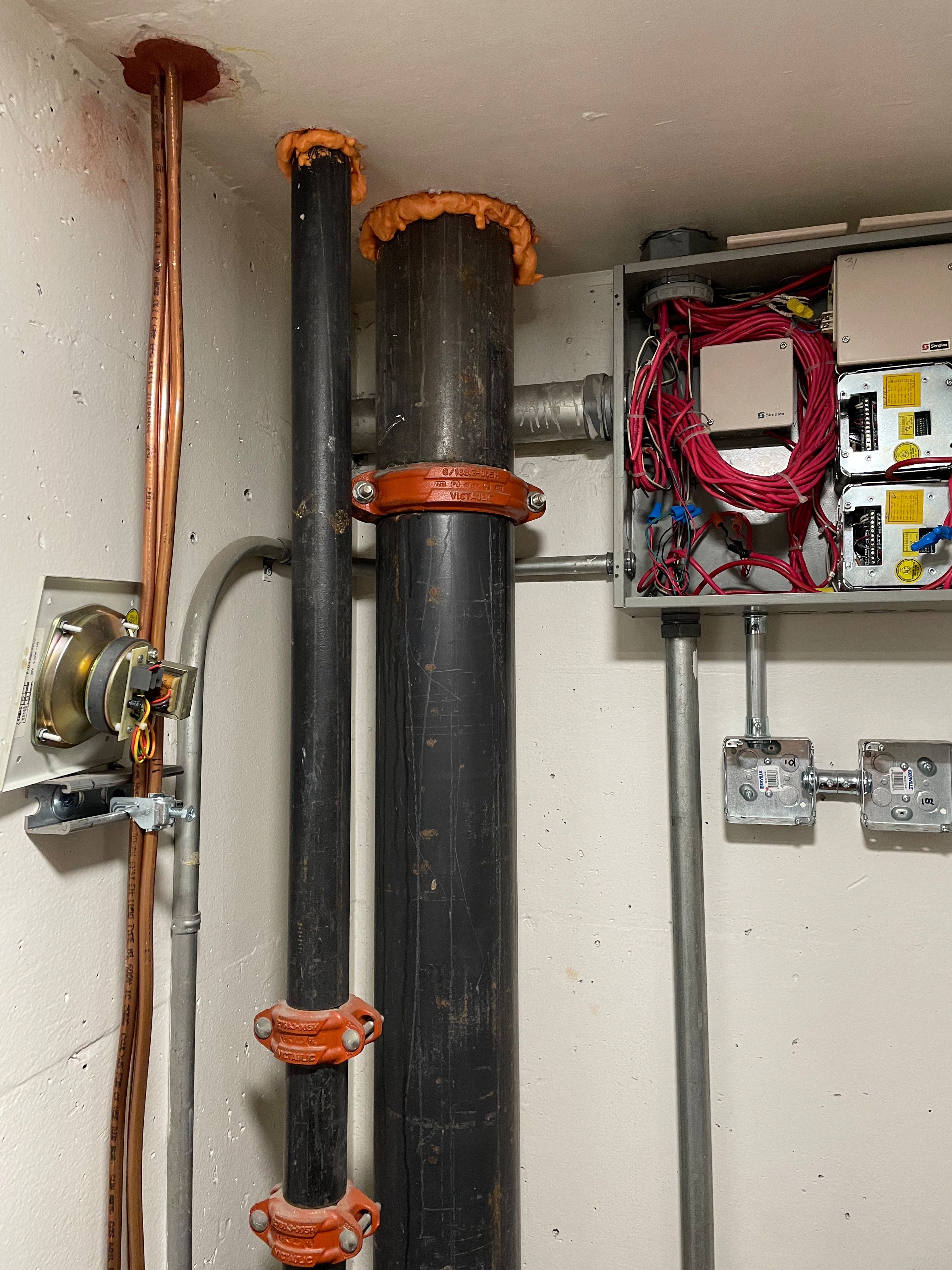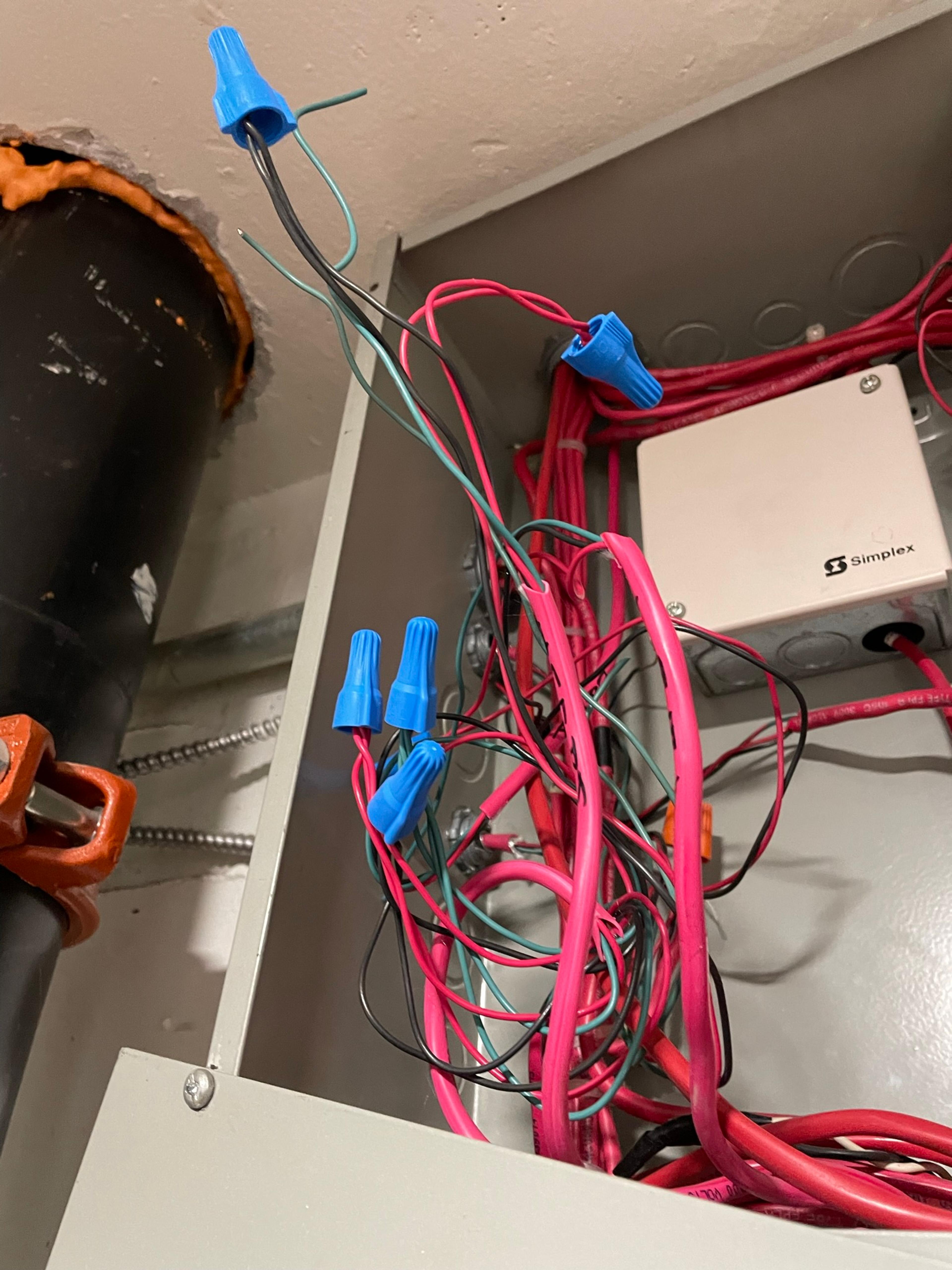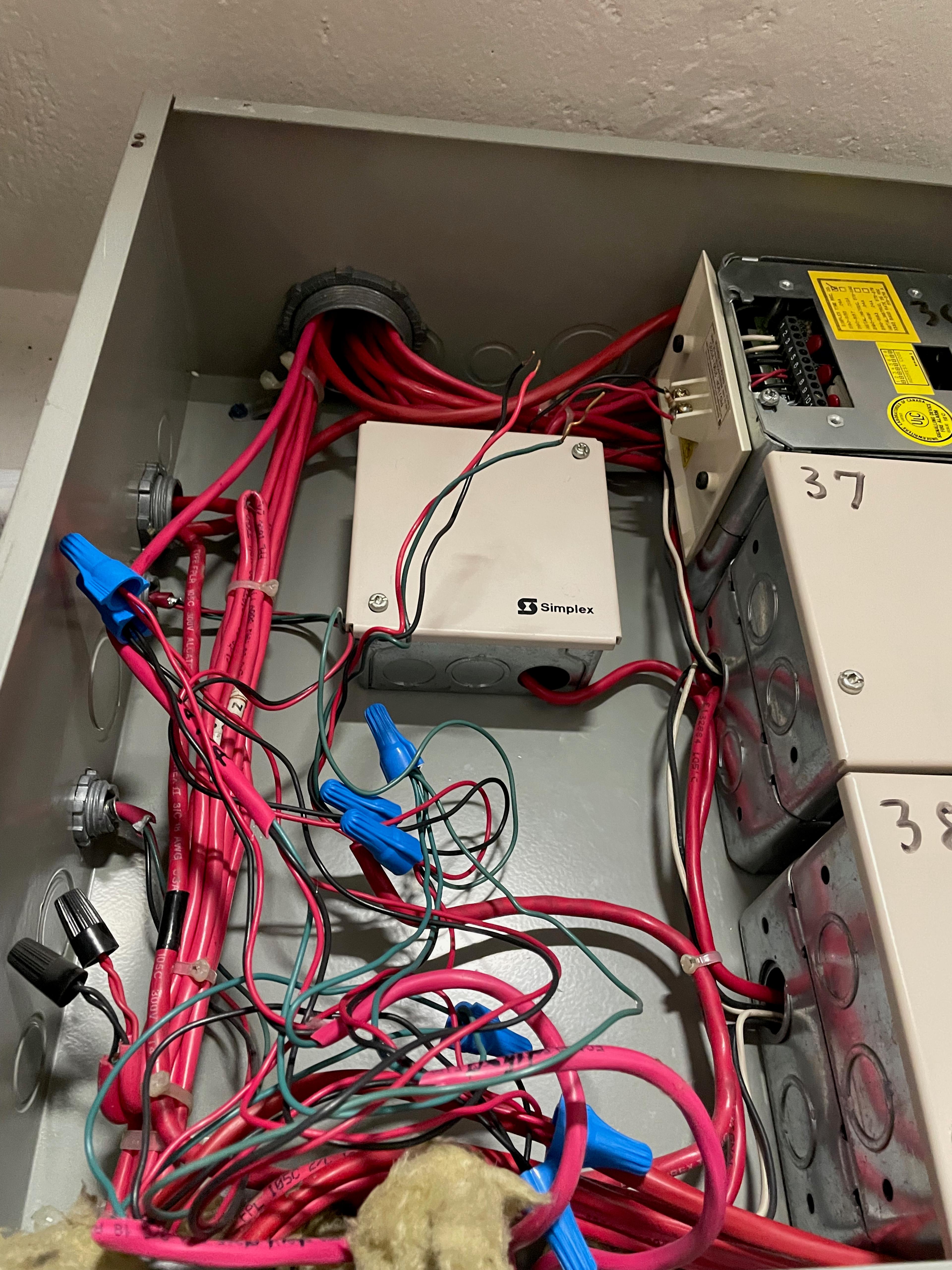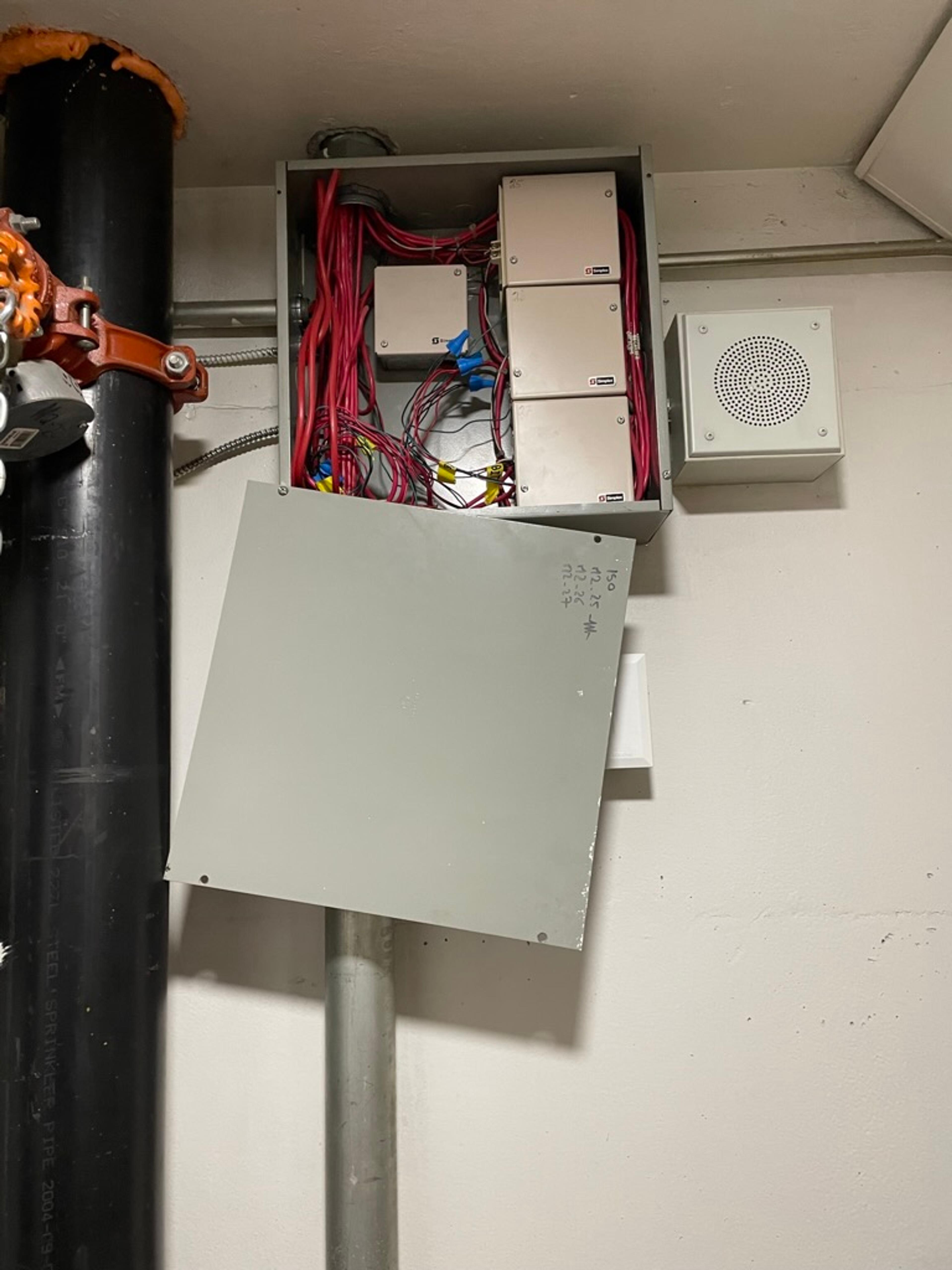 Les fils du système d'alarme continuent d'être à l'air libre alors que les test des systèmes ont lieu sur tous les étages.