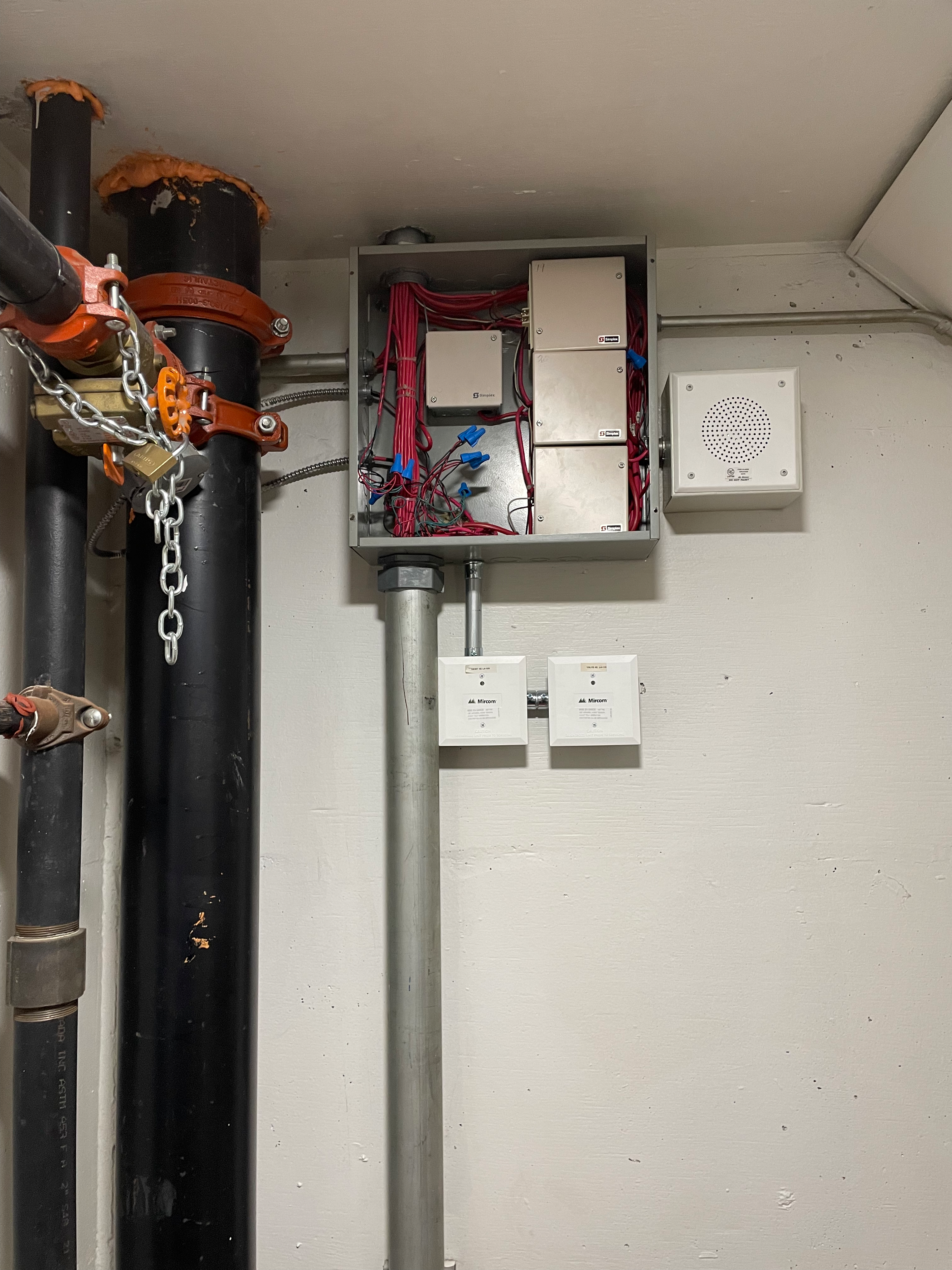 L'appareil Simplex est une boîte blanche montée sur le mur arrière de l'armoire, avec plusieurs fils connectés à elle. Ce composant fait partie du réseau qui surveille et contrôle le système d'alarme incendie de votre bâtiment. Les fils connectés à lui mènent probablement à divers capteurs, alarmes, et éventuellement à un service de surveillance central. L'unité Simplex traiterait les signaux des dispositifs de détection d'incendie, puis activerait les alarmes nécessaires ou les notifications selon la conception du système.