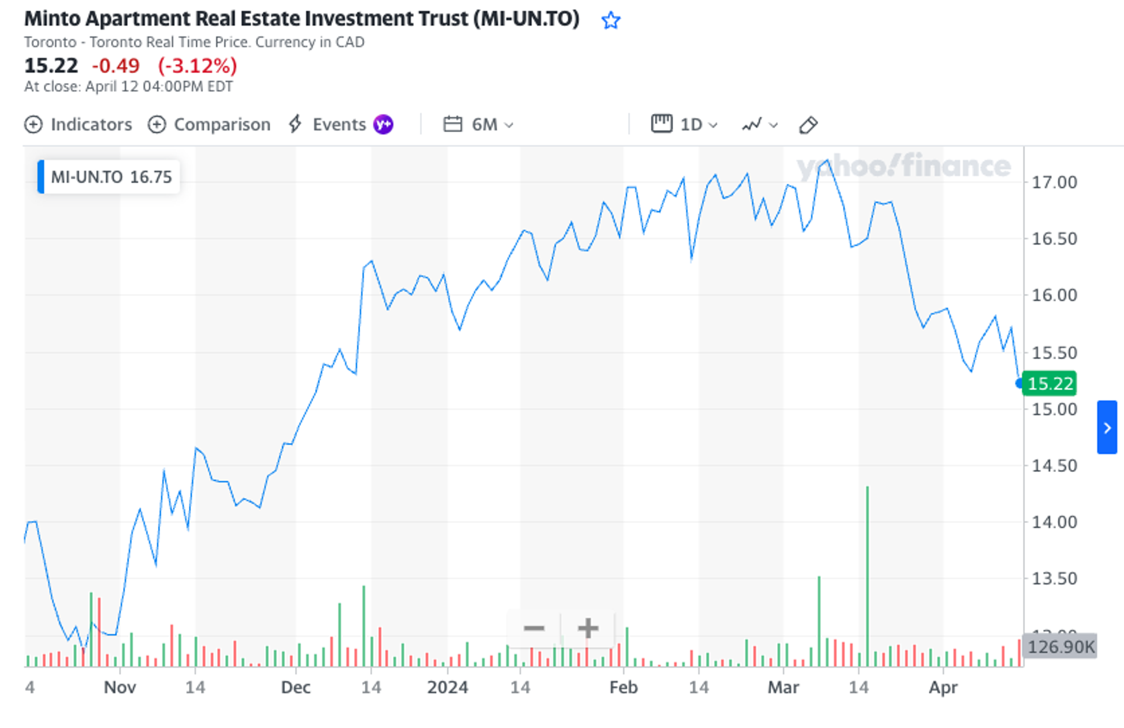 La dernière augmentation a été votée par le conseil d'administration le 7 novembre 2023, et le prix est passé de 13 $ à 17,20 $ le 8 mars 2024, générant une valeur papier considérable pour le groupe Minto, l'actionnaire majoritaire de Minto REIT. Cependant, ce gain a été de courte durée : après la publication du rapport annuel 2023 le 6 mars 2024, l'action a chuté de 11 % à 15,22 $, annulant presque entièrement la hausse de prix que les dividendes augmentés avaient produite. Le niveau élevé de vente la semaine dernière signifie que l'action pourrait continuer à chuter librement à son niveau le plus bas et même en deçà.