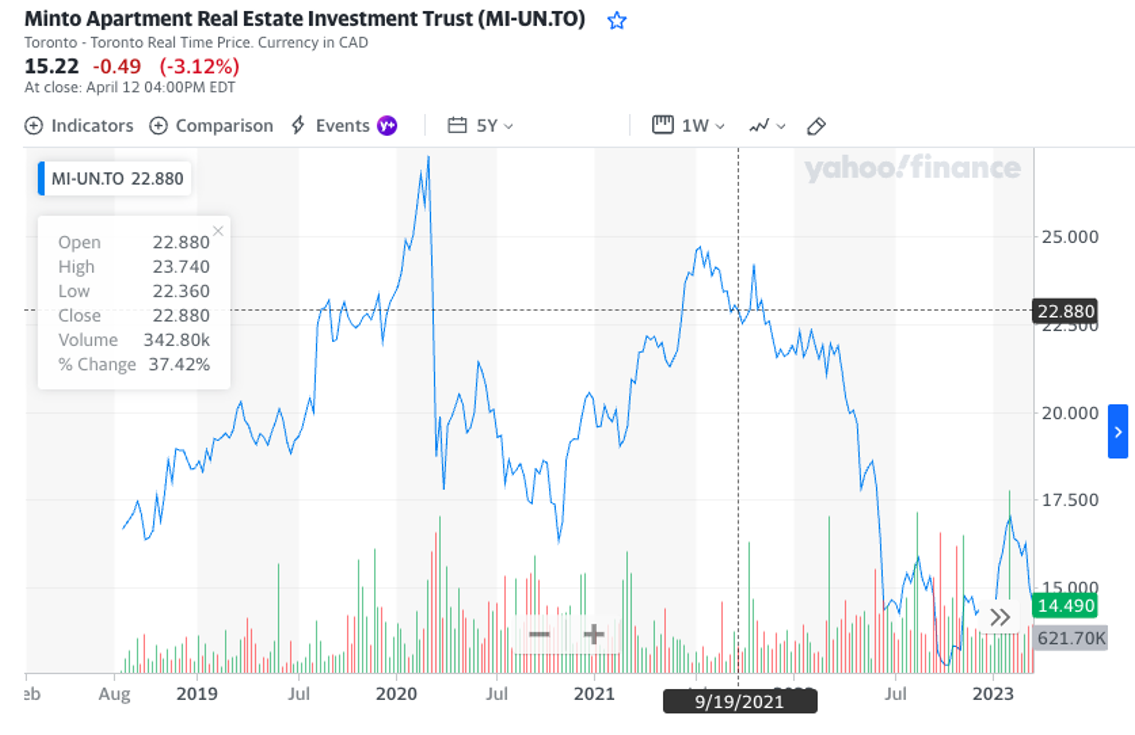 Depuis que Minto REIT a été initialement offerte sur le TSX à 16,59 $ par action, le prix a connu des hauts et des bas, terminant récemment en dessous du prix initial, signifiant que Minto a perdu de l'argent sur toutes les actions qu'elle possédait depuis le début. En effet, depuis la fin de la pandémie, l'action de Minto REIT est passée d'un sommet de 27,31 $ en mars 2020 à une valeur stagnante autour de 15 $, ce qui représente une perte approximative de 10 millions de dollars sur les valeurs des actions détenues par Minto, au lieu d'un gain de 40 millions de dollars à son plus haut. Considérant que l'offre publique initiale a rapporté 200 millions de dollars, cela représente une perte globale de valeur de 5 % - pas au niveau d'Elon Musk, mais tout de même une perte notable, et qui ne va pas dans la bonne direction.