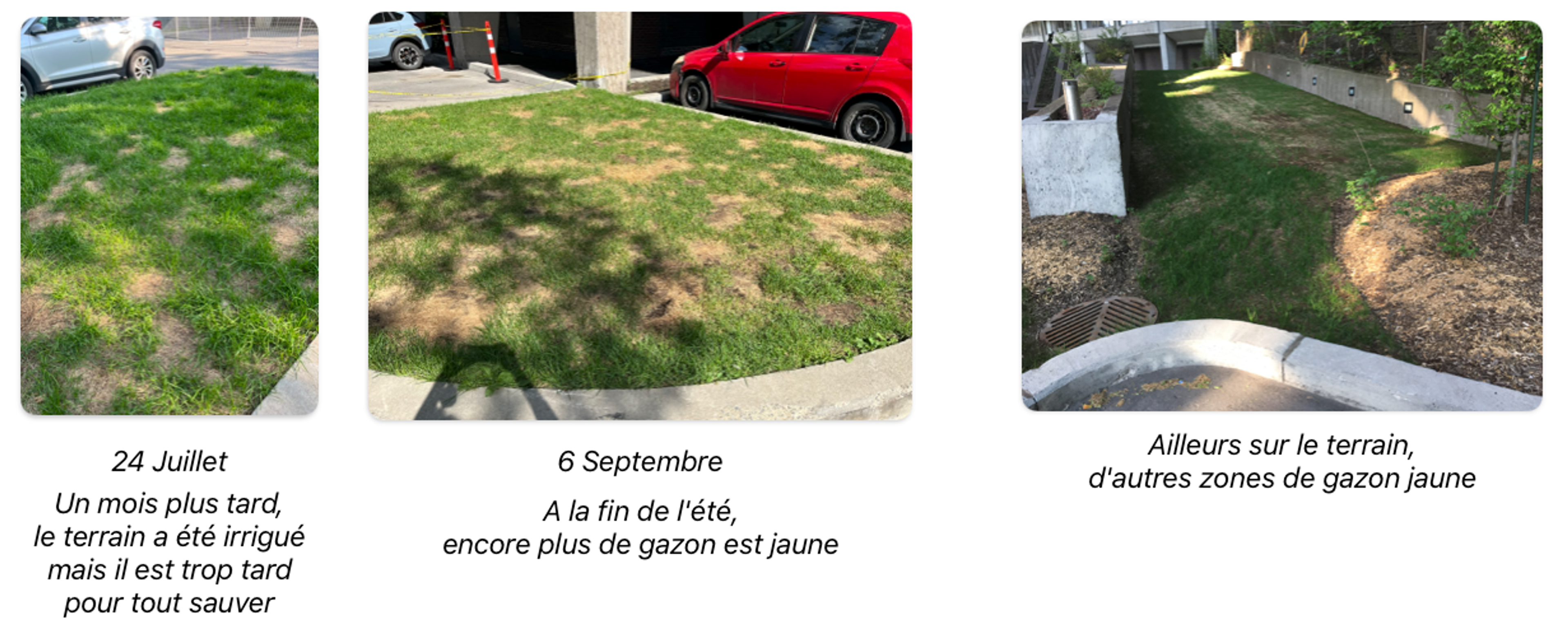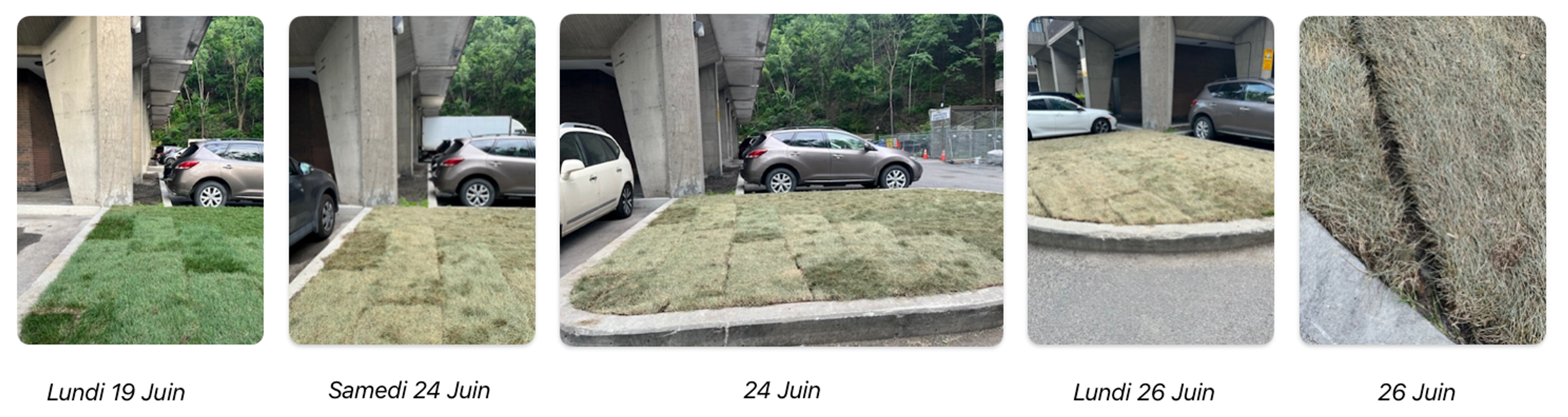 Lundi 19 juin 2023: une équipe de paysagiste installent des rouleaux de gazon frais et bien vert. En une semaine, le gazon laissé à l'abandon désèche jusqu'à devenir du foin. Il ne s'agit pas du résultat d'une canicule, mais bien un mauvais entretien de spécifications du fournisseur de service (payé!), soit arroser régulièrement après installation afin que les racines puissent prendre! Deux mois plus tard, la moitié du gazon est toujours mort, donnant au terrain une apparence hideuse. Ailleurs sur le terrain, on constate la même sorte de négligence.