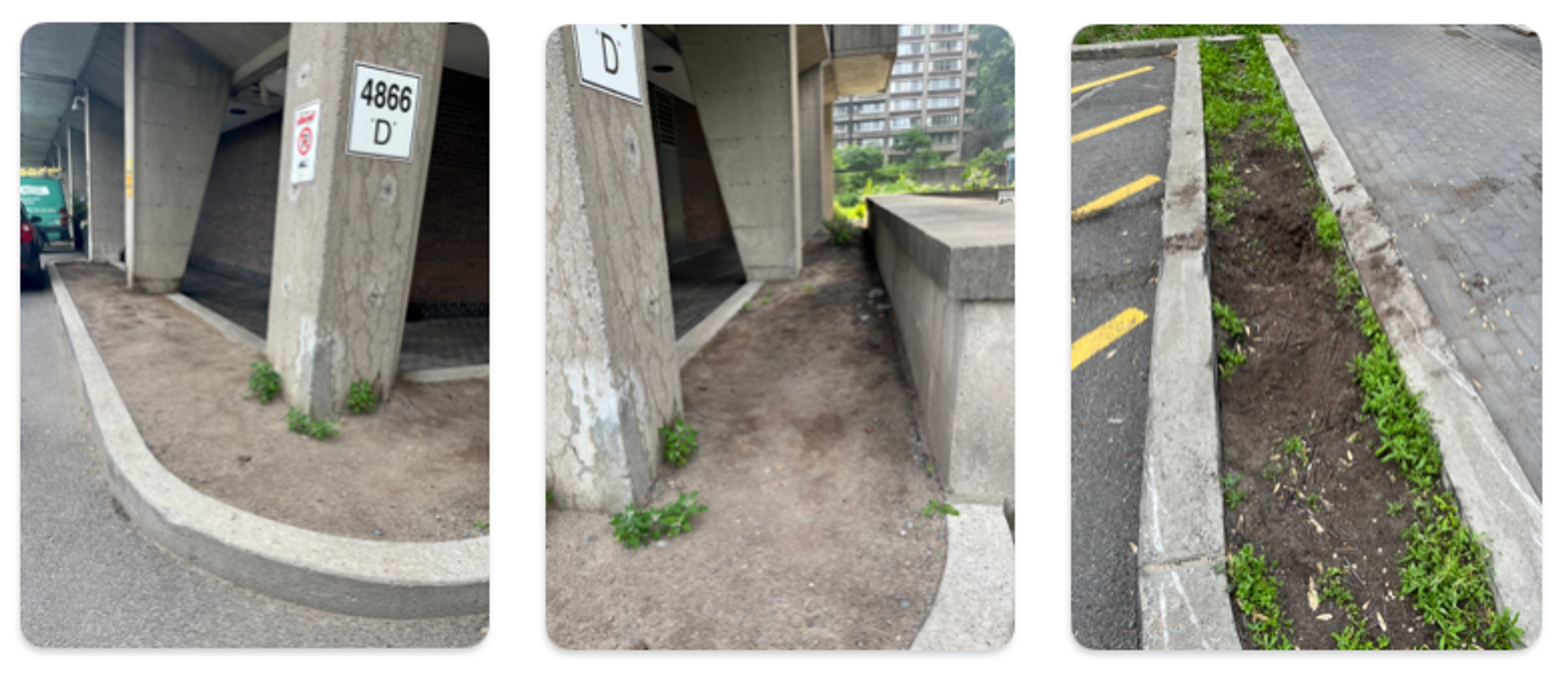 Les chaussées du Rockhill sont entourées de platebandes prévues pour la présence de verdure mais présentement à l'abandon, en proie à l'érosion du sol et la présence de mauvaises herbes.