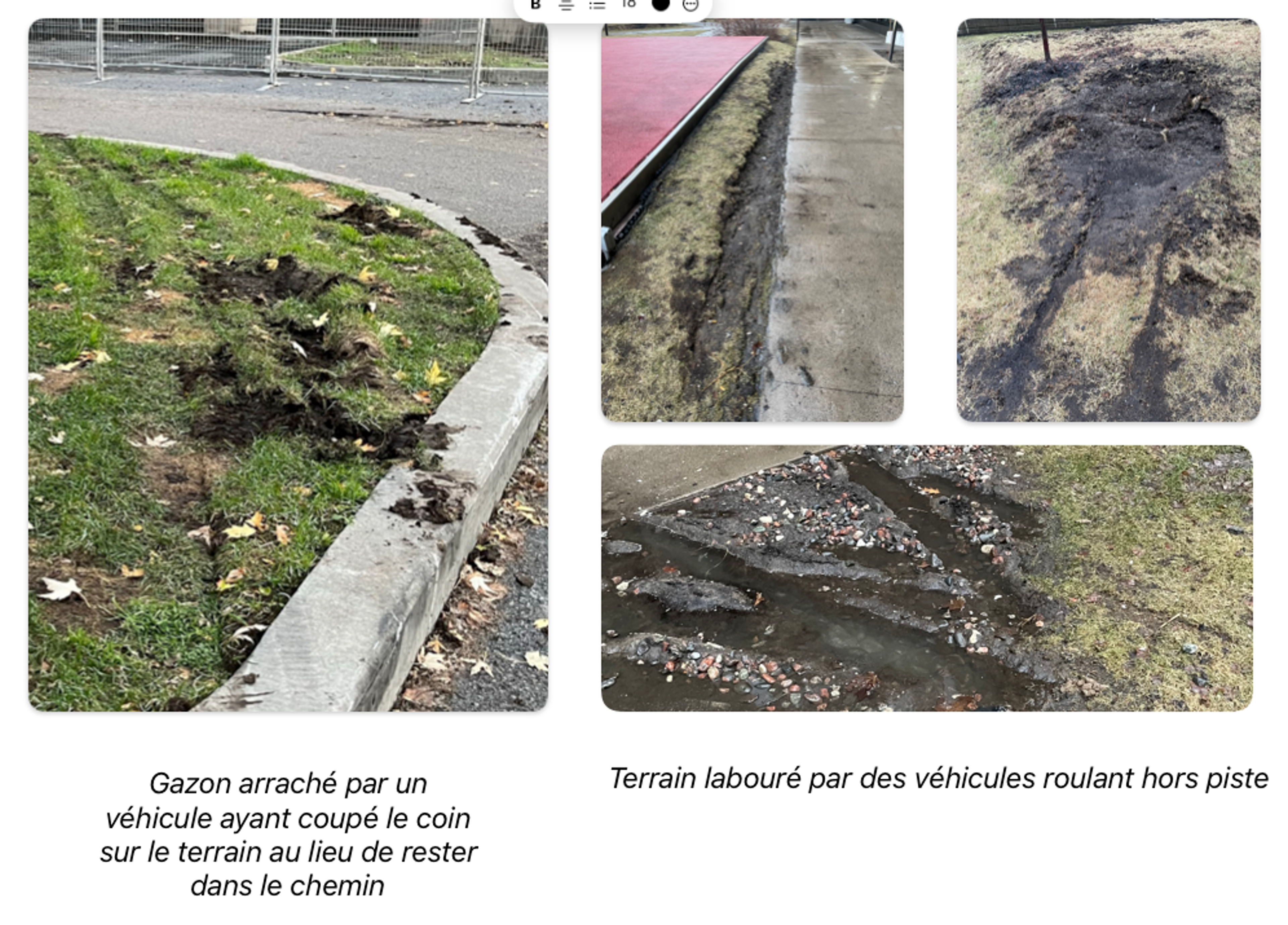L'administration n'ayant aucune personne responsable de l'état des terrains, les opérateurs d'équipements se sentent permis de quitter les chaussées, créant de profonds sillons de boue dans le sol et contribuant à l'apparence de terrain vague non-entretenu. Or une supervision compétente donnerait des directives strictes aux travailleurs de respecter les tracés et rester sur la partie goudronnée, sous peine de sanctions et/ou de renvoi.