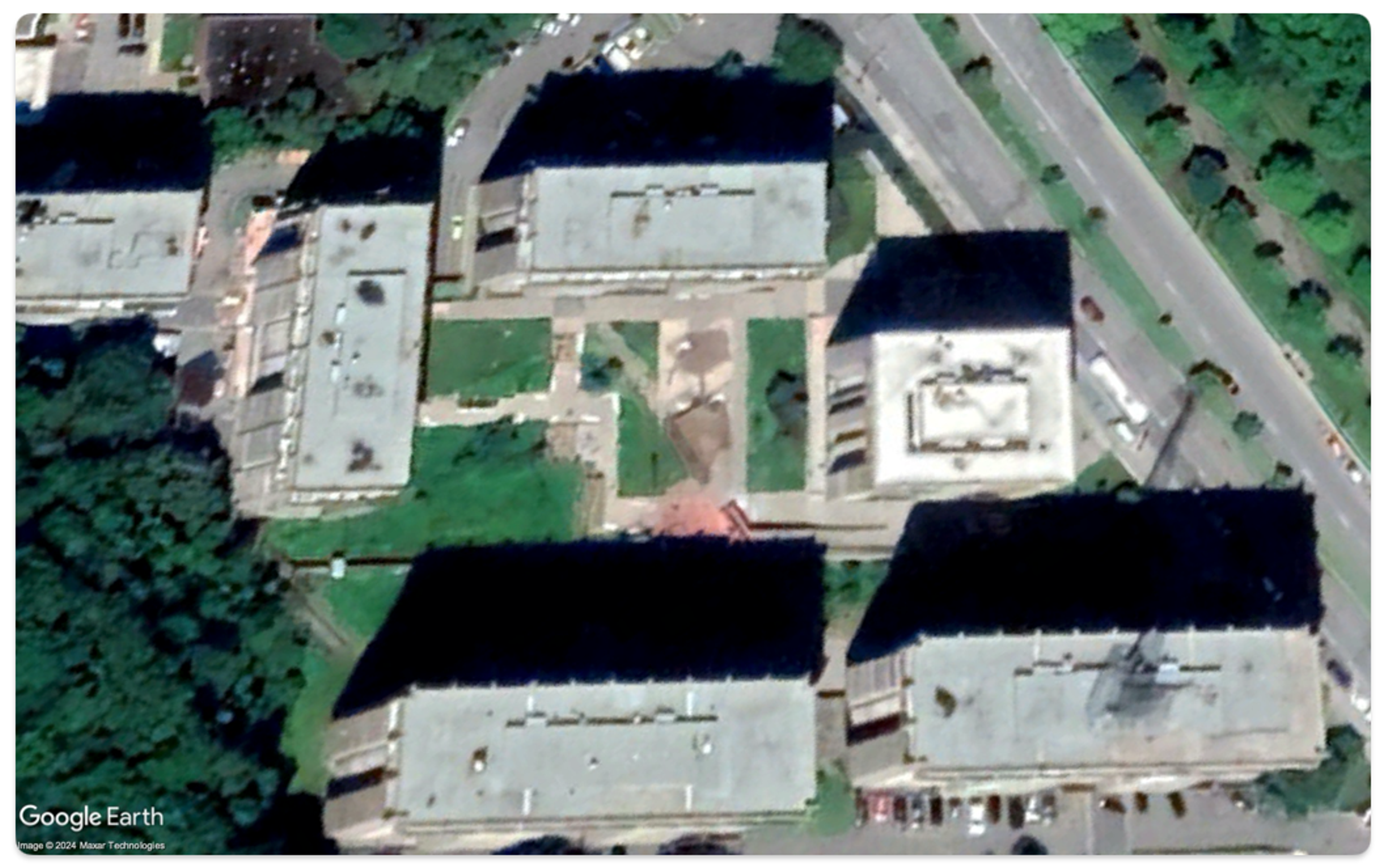 Une photo de mai 2016 montre des platebandes bien aménagées,du gazon vert, des arbres soignés, et une absence de détritus.