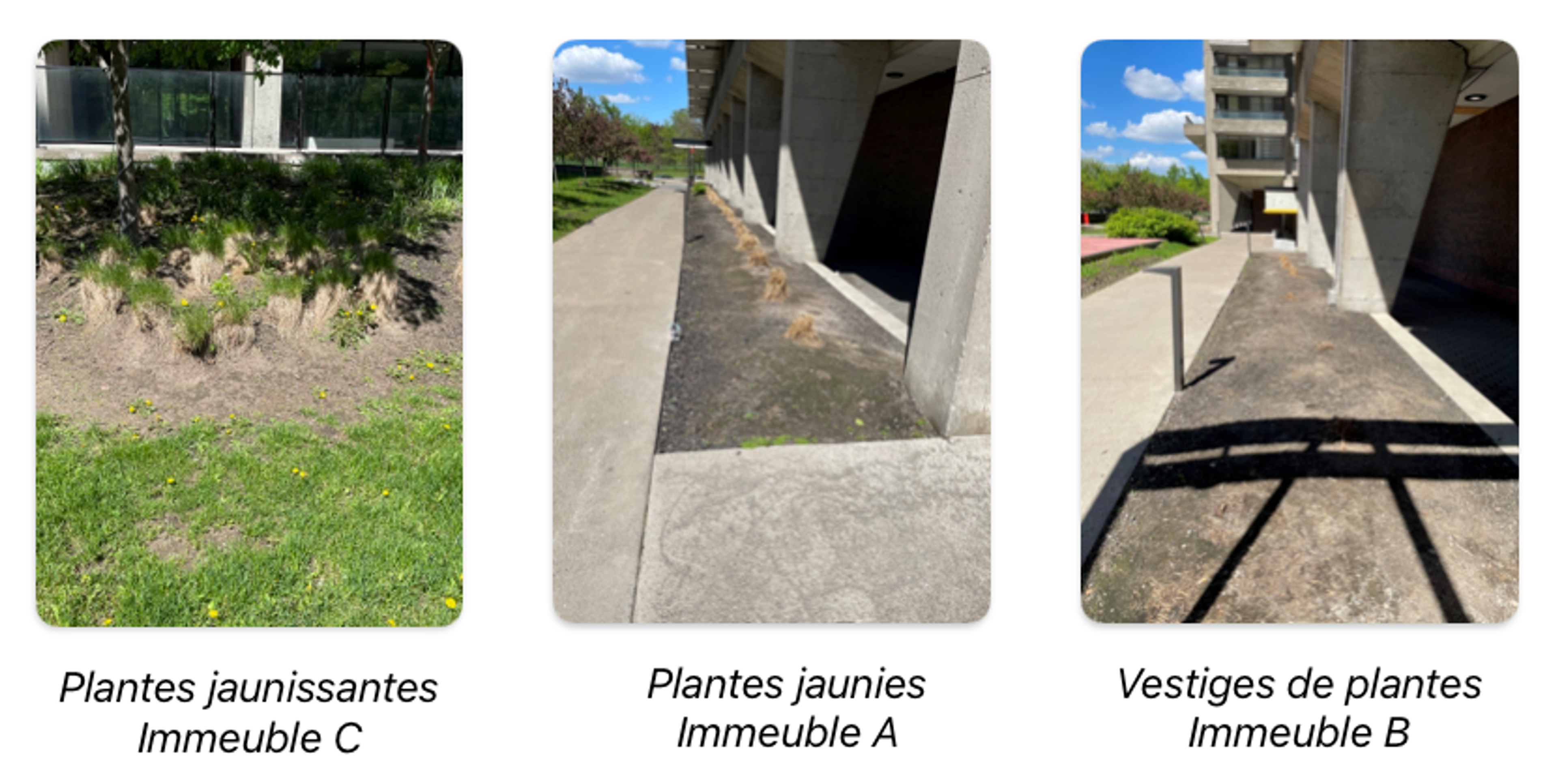 Des groupes de plantes alentour de chaque immeuble sont affectés par un manque d'eau à différent degrés.