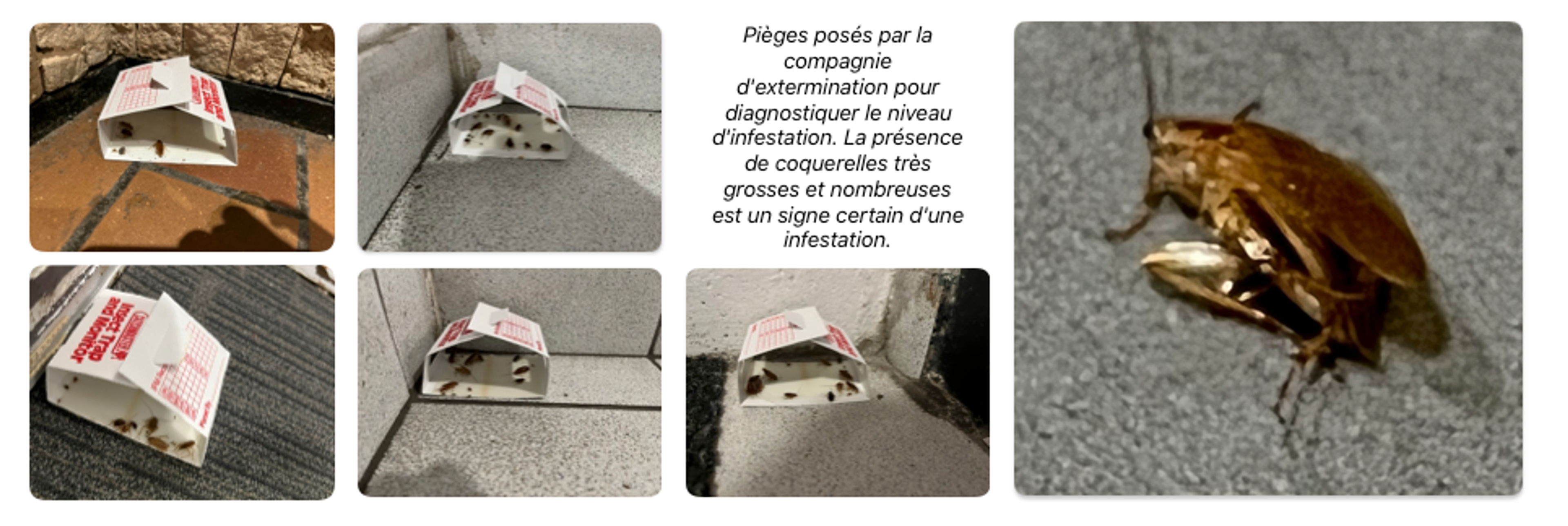 Et effectivement, tel que prévu par les pièges, on aperçoit des coquerelles dans beaucoup d'endroits de l'immeuble F
