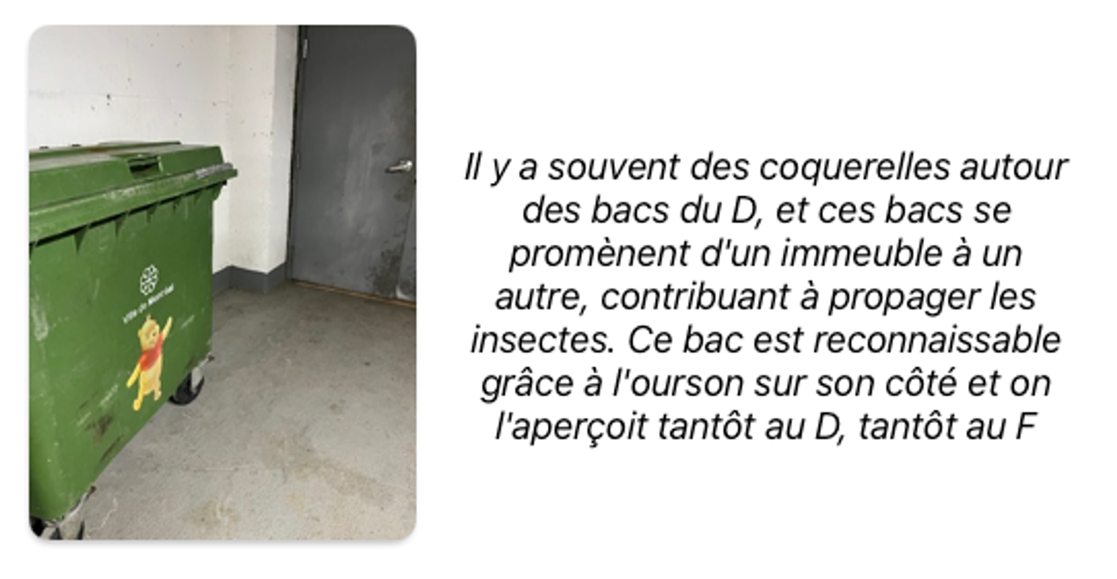 La pratique de faire circuler les bacs entre les immeubles permet à l'infestation de se répandre d'un immeuble à un autre.